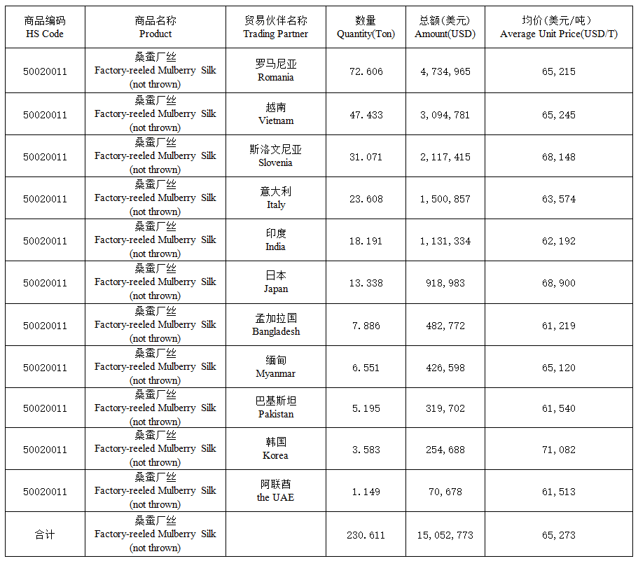 中國 | 中國2023年12月桑蠶廠絲(未加捻)出口數(shù)據(jù)