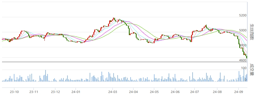 今日(2024年09月12日,周四)中國(guó)繭絲綢交易市場(chǎng)生絲電子指數(shù)下跌0.72%報(bào)收于4648.67點(diǎn)。B絲2022D(商檢4A級(jí)生絲):240925合約下跌0.33萬(wàn)元報(bào)收于47.10萬(wàn)元;250325合約下跌0.51萬(wàn)元報(bào)收于45.63萬(wàn)元;250925合約下跌0.18萬(wàn)元報(bào)收于45.69萬(wàn)元。