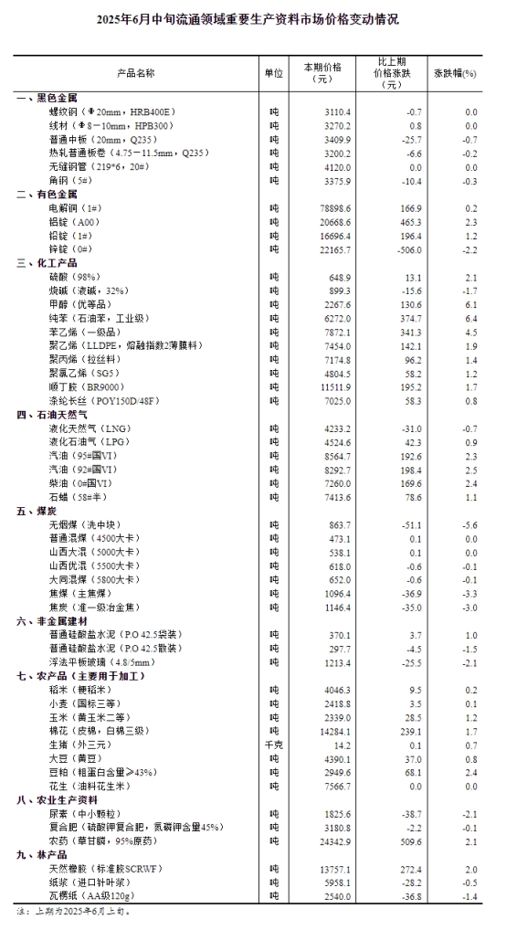 國家統(tǒng)計(jì)局消息,據(jù)對(duì)全國流通領(lǐng)域9大類50種重要生產(chǎn)資料市場(chǎng)價(jià)格的監(jiān)測(cè)顯示,2025年6月中旬與6月上旬相比,27種產(chǎn)品價(jià)格上漲,17種下降,6種持平。