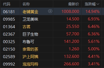 新消費概念股多股上漲,老鋪黃金漲近15%。平安證券指出,消費市場具有韌性,復蘇的勢能正在蓄力,溫和漸進式復蘇或成為主基調,消費代際之間的需求分化將催生更多新需求、新產(chǎn)品及新渠道。需求的多元性也倒逼企業(yè)持續(xù)創(chuàng)新,從滿足消費者需求到前置性地挖掘消費者需求,從依賴傳統(tǒng)大單品到推出創(chuàng)新產(chǎn)品,從依靠經(jīng)銷商到擁抱新渠道,快速響應市場變化的企業(yè)更能在激烈競爭的市場環(huán)境下突出重圍,進而實現(xiàn)產(chǎn)品量價齊升。