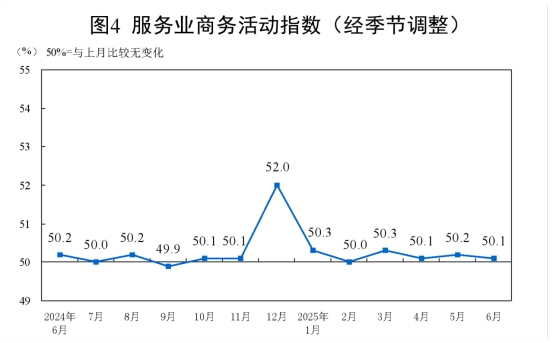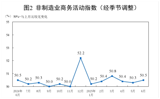 6月份,非制造業(yè)商務(wù)活動(dòng)指數(shù)為50.5%,比上月上升0.2個(gè)百分點(diǎn),非制造業(yè)總體繼續(xù)保持?jǐn)U張。