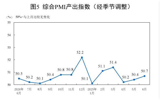 6月份,綜合PMI產(chǎn)出指數(shù)為50.7%,比上月上升0.3個(gè)百分點(diǎn),表明我國(guó)企業(yè)生產(chǎn)經(jīng)營(yíng)活動(dòng)總體擴(kuò)張有所加快。