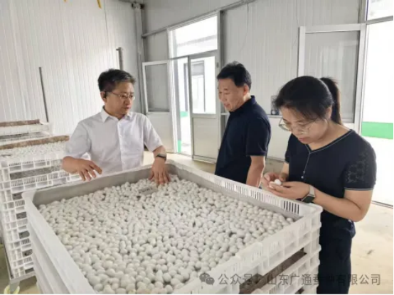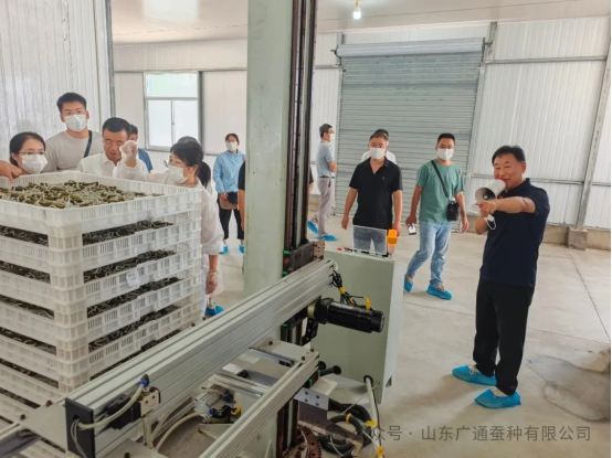 首先,集團公司房德文向會議代表介紹了廣通蠶種集團的基本情況和人工飼料養(yǎng)蠶基地的建設情況及功能定位;然后,與會代表在房德文、谷愛雷的陪同下,現(xiàn)場參觀了人工飼料大蠶飼育、上蔟結繭及人工飼料熟化車間。參觀期間與會代表就人工飼料養(yǎng)蠶技術、飼養(yǎng)品種、機械設備、飼料成分等進行了詳細了解,對廣通在人工飼料養(yǎng)蠶方面取得的進步表示充分認可和稱贊;其后,代方銀理事長、貴州蠶研所羅朝斌研究員和邢丹副所長又專程前往貴州制種基地參觀考察,參觀考察結束后在會議室進行了座談交流,代方銀理事長表示:廣通集團作為國家蠶種產(chǎn)業(yè)的頭部企業(yè),無論是在蠶種生產(chǎn)規(guī)模、品種研發(fā)、蠶種科技等方面都走在了全國蠶種業(yè)的前列,起到了頭部企業(yè)的引領作用;廣通人工飼料原蠶飼育采取的1-3齡飼料育+4-5齡適齡轉桑的飼育模式,對“聯(lián)農(nóng)助農(nóng)”、鄉(xiāng)村振興起到很好地促進帶動作用,值得充分肯定;西南大學資源昆蟲高效養(yǎng)殖與利用全國重點實驗室、貴州省農(nóng)科院蠶桑研究所和廣通集團將聯(lián)合開展基因標記育種技術的應用,重點突破人工飼料蠶品種攝食性和強健性的瓶頸,加快科技成果的轉化應用進程,共同促進我國蠶種產(chǎn)業(yè)的高質(zhì)量發(fā)展。