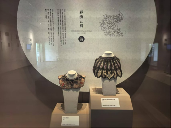 沿著展廳繼續(xù)前行,實(shí)踐隊(duì)員們來到了清代彩繡云肩的展示區(qū)域。這些彩繡云肩造型別致,由精巧的花瓣形狀拼接而成,散發(fā)著獨(dú)特魅力。湊近細(xì)看,其繡工極為細(xì)膩,針法豐富多樣,絲線色彩搭配和諧且富有層次感,一朵朵花卉圖案仿佛即將綻放,栩栩如生。館內(nèi)工作人員向?qū)嵺`隊(duì)員們介紹,在清代,云肩不僅僅是裝飾衣物,更是身份與地位的象征,不同樣式和繡工的云肩會(huì)出現(xiàn)在不同的禮儀場合?!斑@些彩繡云肩以其精湛技藝,承載著清代獨(dú)特的服飾文化與審美風(fēng)尚,讓我們深刻體會(huì)到絲綢在古代社會(huì)生活中的重要地位?!睂?shí)踐隊(duì)隊(duì)長韓同學(xué)說道。