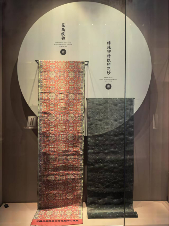 圖為唐代花鳥紋錦與綠地狩獵紋印花紗