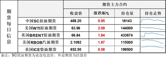【1】WTI主力原油期貨收漲1.31美元,漲幅2.09%,報63.96美元/桶;布倫特主力原油期貨收漲1.21美元,漲幅1.84%,報66.84美元/桶;INE原油期貨收漲0.95%,報488.2元。
