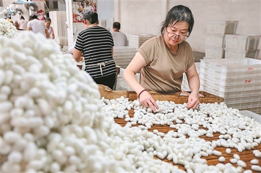 8月12日,在蒙山縣一家蠶絲企業(yè),工人正在忙碌作業(yè),確保按時完成訂單。近年來,該縣積極構(gòu)建從種桑養(yǎng)蠶到繅絲織綢、服裝加工的完整產(chǎn)業(yè)鏈,目前全縣桑園種植面積達(dá)6.3萬畝,帶動1.2萬農(nóng)戶就業(yè)增收,桑蠶產(chǎn)業(yè)成為縣域經(jīng)濟(jì)發(fā)展的支柱產(chǎn)業(yè)。