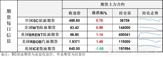 【1】WTI主力原油期貨收漲0.62美元,漲幅0.99%,報(bào)63.42美元/桶;布倫特主力原油期貨收漲0.75美元,漲幅1.14%,報(bào)66.6美元/桶;INE原油期貨收漲0.7%,報(bào)488.6元。