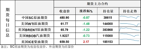 【1】WTI主力原油期貨收跌0.93美元,跌幅1.48%,報(bào)61.77美元/桶;布倫特主力原油期貨收跌0.81美元,跌幅1.22%,報(bào)65.79美元/桶;INE原油期貨收跌0.87%,報(bào)480.9元。