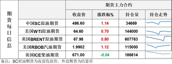 【1】WTI主力原油期貨收漲0.45美元,漲幅0.7%,報64.6美元/桶;布倫特主力原油期貨收漲0.54美元,漲幅0.8%,報67.98美元/桶;INE原油期貨收漲1.14%,報486.6元。