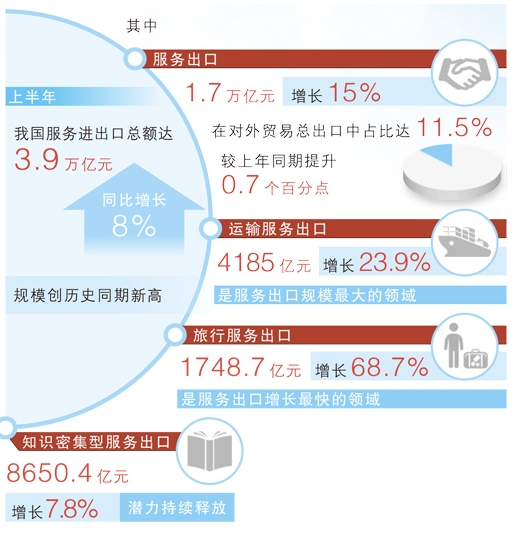 據(jù)新華社北京8月27日電 (記者謝?,帲┙衲晟习肽辏覈?guó)服務(wù)進(jìn)出口總額創(chuàng)歷史同期新高,旅行服務(wù)進(jìn)出口規(guī)模超過1萬億元,增速達(dá)到12.3%。預(yù)計(jì)全年服務(wù)貿(mào)易仍將保持增長(zhǎng),貿(mào)易結(jié)構(gòu)將持續(xù)優(yōu)化。
