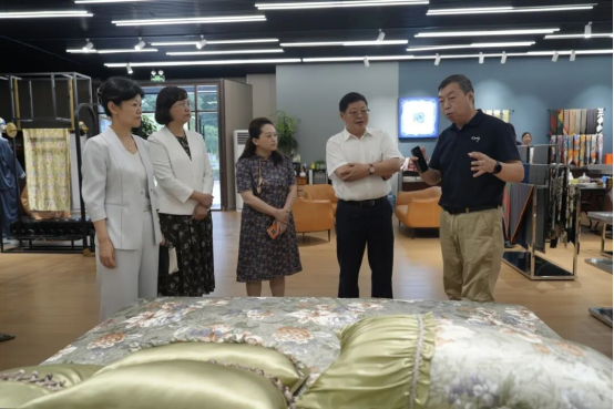 調(diào)研組一行參觀了企業(yè)產(chǎn)品展廳,副總經(jīng)理崔新昌向調(diào)研組展示了大染坊的原創(chuàng)設(shè)計(jì)產(chǎn)品,企業(yè)始終堅(jiān)持傳統(tǒng)與現(xiàn)代、科技與綠色相融并重、守正與創(chuàng)新共生的研發(fā)理念,讓古老的絲綢技藝不斷煥發(fā)新的生命力。