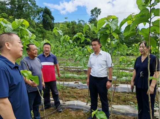專家服務(wù)團(tuán)在蓬東鄉(xiāng)與蠶農(nóng)交流,查看新栽桑苗長勢