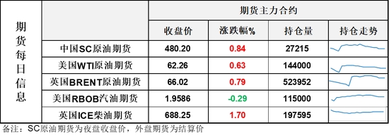 【1】WTI主力原油期貨收漲0.39美元,漲幅0.63%,報62.26美元/桶;布倫特主力原油期貨收漲0.52美元,漲幅0.79%,報66.02美元/桶;INE原油期貨收漲0.84%,報480.2元。