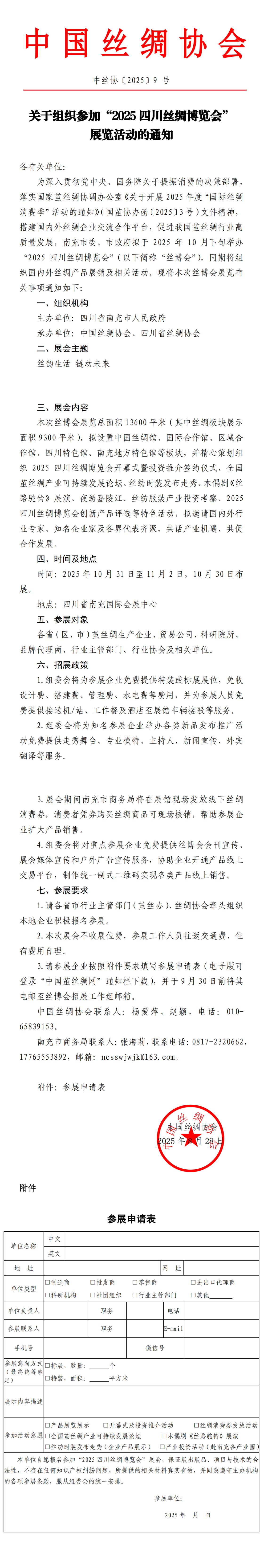 行業(yè)新聞丨中國(guó)絲綢協(xié)會(huì)關(guān)于組織參加“2025四川絲綢博覽會(huì)”展覽活動(dòng)的通知
