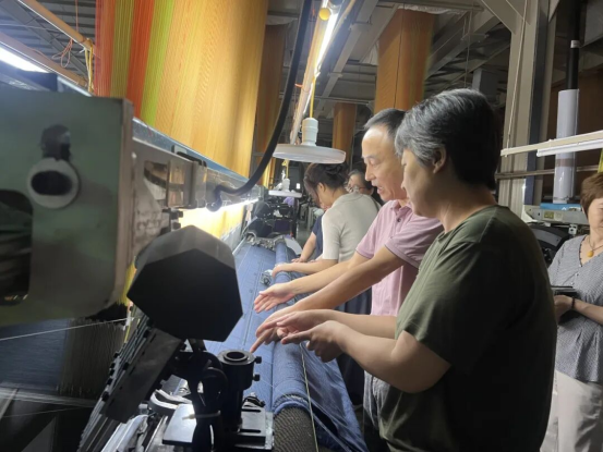 會(huì)后,老師們走進(jìn)生產(chǎn)車(chē)間,了解劍桿提花織機(jī)的裝造規(guī)格及現(xiàn)有品種的織造過(guò)程,并在織機(jī)上與設(shè)計(jì)人員一同探討花型織造中出現(xiàn)的問(wèn)題。