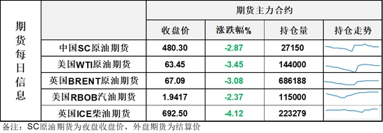 【1】WTI主力原油期貨收跌2.27美元,跌幅3.45%,報(bào)63.45美元/桶;布倫特主力原油期貨收跌2.13美元,跌幅3.08%,報(bào)67.09美元/桶;INE原油期貨收跌2.87%,報(bào)480.3元。