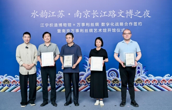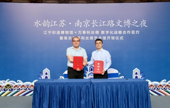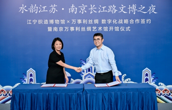 9月29日,作為“水韻江蘇·南京長江路文博之夜”的重要主題活動(dòng)之一,“江寧織造博物館”與“江蘇萬事利文化科技有限公司”正式簽署數(shù)字化戰(zhàn)略合作協(xié)議,南京萬事利絲綢藝術(shù)館同步開館。此次簽約不僅是兩家文化標(biāo)桿單位的強(qiáng)強(qiáng)聯(lián)合,更標(biāo)志著“江寧織造博物館、萬事利絲綢、文都云”三方數(shù)字化合作全面啟動(dòng),共同在長江路上開啟南京文博數(shù)字化發(fā)展的新篇章。