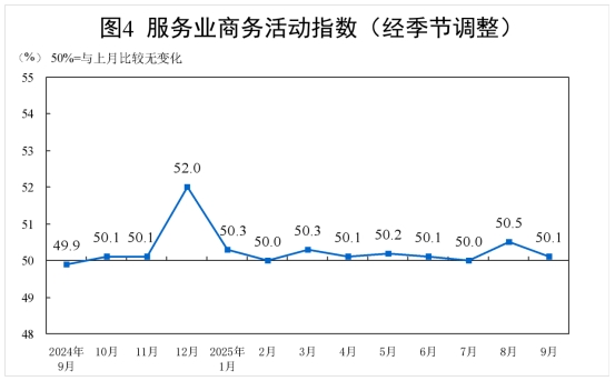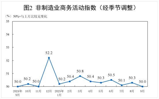9月份,非制造業(yè)商務(wù)活動指數(shù)為50.0%,比上月下降0.3個百分點,位于臨界點,非制造業(yè)業(yè)務(wù)總量總體穩(wěn)定。