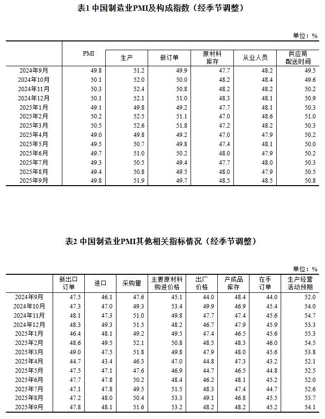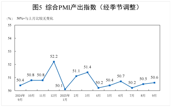 9月份,綜合PMI產(chǎn)出指數(shù)為50.6%,比上月上升0.1個百分點,持續(xù)高于臨界點,表明我國企業(yè)生產(chǎn)經(jīng)營活動總體擴張繼續(xù)加快。