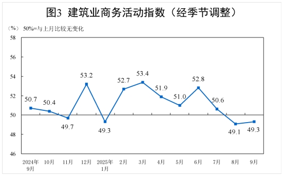 分行業(yè)看,建筑業(yè)商務(wù)活動指數(shù)為49.3%,比上月上升0.2個百分點;服務(wù)業(yè)商務(wù)活動指數(shù)為50.1%,比上月下降0.4個百分點。從服務(wù)業(yè)行業(yè)看,郵政、電信廣播電視及衛(wèi)星傳輸服務(wù)、貨幣金融服務(wù)等行業(yè)商務(wù)活動指數(shù)均位于60.0%以上高位景氣區(qū)間;餐飲、房地產(chǎn)、文化體育娛樂等行業(yè)商務(wù)活動指數(shù)均低于臨界點。