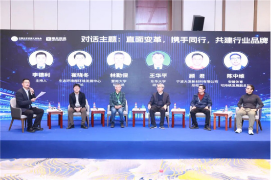 在對(duì)話環(huán)節(jié),主持人中國化學(xué)纖維工業(yè)協(xié)會(huì)循環(huán)再利用化學(xué)纖維分會(huì)秘書長(zhǎng)李德利與東華大學(xué)研究員王華平、暨南大學(xué)教授林勤保、生態(tài)環(huán)境部環(huán)境發(fā)展中心部長(zhǎng)崔曉冬、寧波大發(fā)新材料有限公司總經(jīng)理顧君、安踏集團(tuán)可持續(xù)發(fā)展副總監(jiān)陳中維,圍繞循環(huán)再利用化學(xué)纖維行業(yè)發(fā)展趨勢(shì)、品牌方對(duì)再生材料需求及要求、生產(chǎn)工藝技術(shù)路徑選擇、經(jīng)濟(jì)效益和社會(huì)效益的矛盾與抉擇、再生纖維鑒別方法及應(yīng)用、碳匯核算機(jī)制等行業(yè)焦點(diǎn)問題展開深入探討。