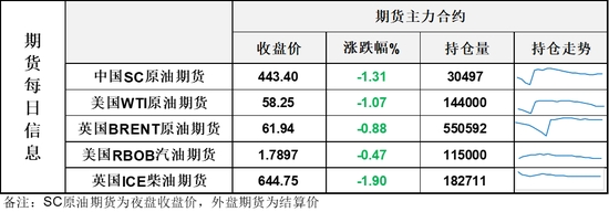 【1】WTI主力原油期貨收跌0.63美元,跌幅1.07%,報(bào)58.25美元/桶;布倫特主力原油期貨收跌0.55美元,跌幅0.88%,報(bào)61.94美元/桶;INE原油期貨收跌1.31%,報(bào)443.4元。