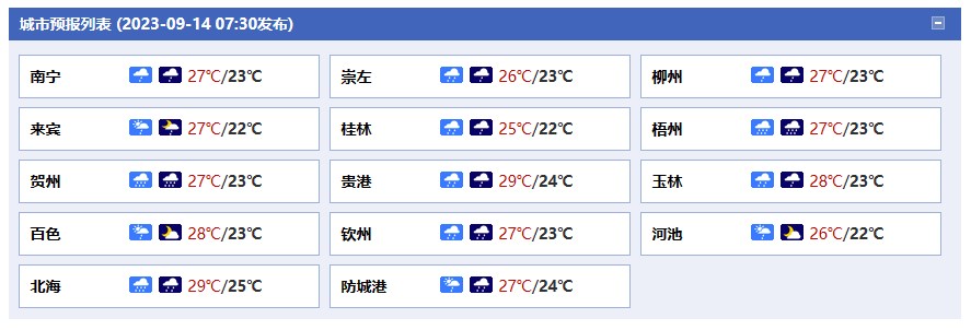 南寧市:今天白天小雨、局部中雨,今天晚上陰天有小雨,東北風1~2級,最高氣溫27℃,最低氣溫23℃。