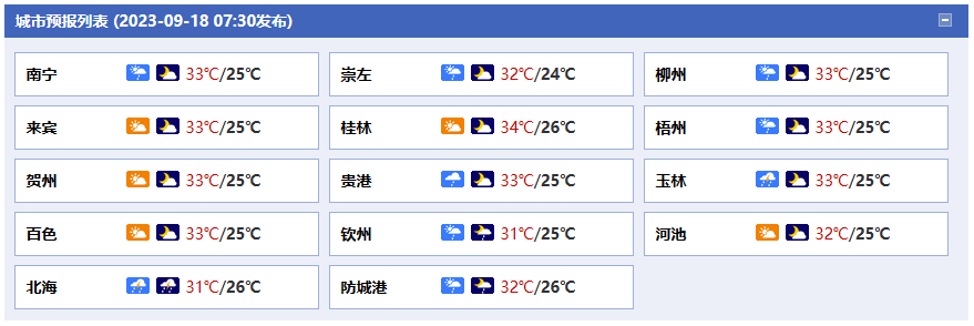 南寧市:今天白天多云,有陣雨或雷雨,今天晚上多云,東南風(fēng)1~2級(jí),最高氣溫33℃,最低氣溫25℃。