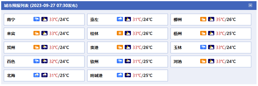南寧市:今天白天到晚上多云有陣雨,偏東風1~2級,最高氣溫33℃,最低氣溫24℃。