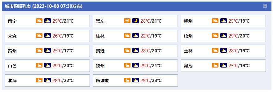 南寧市:今天白天到晚上,多云間陰天,局地有陣雨,東北風(fēng)2~3級,最高氣溫29℃,最低氣溫21℃。