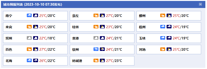 今天白天到晚上,賀州、梧州、玉林、貴港、南寧、北海、欽州、防城港等市有陣雨、局地大雨到暴雨,我區(qū)其它地區(qū)多云到陰天、局地有陣雨。