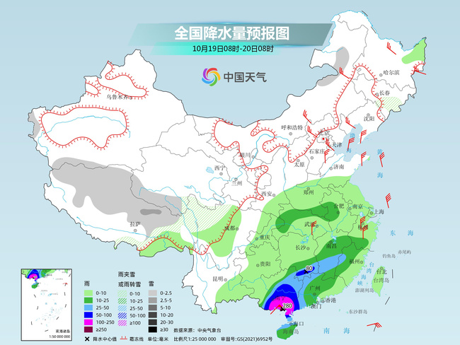 受臺風(fēng)和冷空氣共同影響,未來三天(10月19日至21日),華南部分地區(qū)強降雨連連,廣東、廣西等局地有特大暴雨,需防范連續(xù)強降雨可能引發(fā)的次生災(zāi)害。氣溫方面,隨著冷空氣繼續(xù)東移南下,中東部氣溫將大面積刷新立秋后的新低,南方冷暖轉(zhuǎn)換明顯,公眾請及時調(diào)整著裝,謹防感冒。