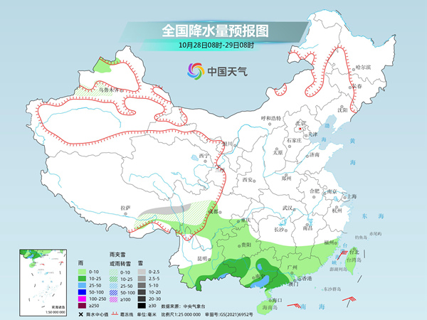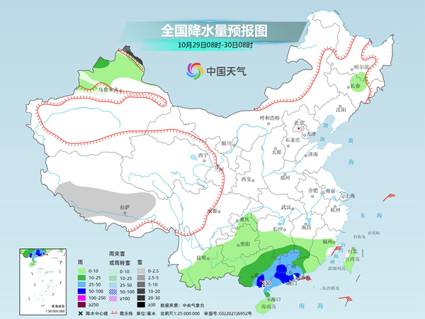 周日,江南降雨基本結(jié)束,最強(qiáng)降雨會(huì)出現(xiàn)在廣東、廣西,局地有大暴雨。新疆北部、西藏中部等地的部分地區(qū)有小到中雪或雨夾雪,其中,新疆北疆北部的部分地區(qū)有大到暴雪;江南南部、華南大部等地的部分地區(qū)有中到大雨,其中,廣西東南部、廣東中西部等地的部分地區(qū)有暴雨,局地大暴雨。