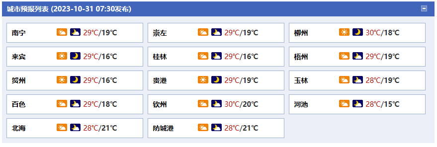今天白天到11月1日晚上,全區(qū)多云到晴。