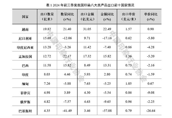 從主要出口國(guó)家來(lái)看,我國(guó)印染行業(yè)對(duì)出口規(guī)模排名前十國(guó)家的出口總量達(dá)102.54億米,占總出口量的42.39%。其中,對(duì)越南、孟加拉國(guó)、巴西的出口規(guī)模實(shí)現(xiàn)兩位數(shù)增長(zhǎng),對(duì)印度、菲律賓的出口也實(shí)現(xiàn)小幅增長(zhǎng)。越南、孟加拉國(guó)是全球重要的紡織服裝出口國(guó),在國(guó)內(nèi)宏觀經(jīng)濟(jì)改善、歐美發(fā)達(dá)經(jīng)濟(jì)體優(yōu)惠關(guān)稅政策支持、本地紡織服裝產(chǎn)業(yè)加快恢復(fù)等因素支撐下,越南、孟加拉國(guó)紡織服裝貿(mào)易改善態(tài)勢(shì)明顯,帶動(dòng)其對(duì)我國(guó)印染面料的需求保持較快增長(zhǎng)。巴西作為人口大國(guó)及其在北美轉(zhuǎn)口貿(mào)易中的獨(dú)特優(yōu)勢(shì),對(duì)我國(guó)印染產(chǎn)品的需求逐步提升。我國(guó)印染行業(yè)對(duì)尼日利亞、俄羅斯、巴基斯坦等國(guó)家的出口呈現(xiàn)明顯下滑態(tài)勢(shì),其中對(duì)巴基斯坦出口數(shù)量下降幅度超過(guò)40%,主要原因在于2024年巴基斯坦能源成本大幅上漲,紡織產(chǎn)品國(guó)際市場(chǎng)競(jìng)爭(zhēng)力下降,當(dāng)?shù)丶徔椃b企業(yè)對(duì)我國(guó)印染面料的需求明顯減少。前三季度,出口規(guī)模排名前十的國(guó)家中,僅對(duì)越南、緬甸的產(chǎn)品出口單價(jià)小幅提升,其余國(guó)家均呈現(xiàn)下跌態(tài)勢(shì),其中菲律賓、巴基斯坦等國(guó)下降幅度較大。市場(chǎng)需求不足疊加當(dāng)?shù)赜∪井a(chǎn)能逐步釋放,我國(guó)印染行業(yè)出口進(jìn)一步承壓,以價(jià)換量成為企業(yè)穩(wěn)定發(fā)展的普遍策略。