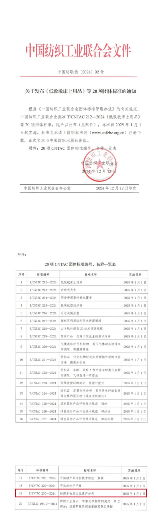根據(jù)《中國紡織?業(yè)聯(lián)合會團(tuán)體標(biāo)準(zhǔn)管理辦法》的有關(guān)規(guī)定,中國紡織?業(yè)聯(lián)合會于2024年12月31日批準(zhǔn)發(fā)布T/CNTAC230-2024《紡織?物質(zhì)?化遺產(chǎn)分類》團(tuán)體標(biāo)準(zhǔn),該標(biāo)準(zhǔn)?2025年1?1?起實(shí)施。