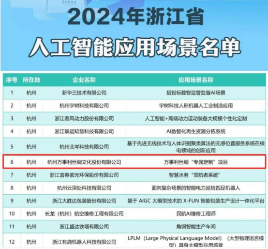 萬事利絲綢主導(dǎo)的“人工智能專屬定制”項目入選《2024年浙江省人工智能應(yīng)用場景名單》