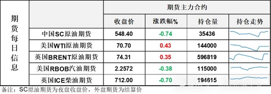 【1】WTI主力原油期貨收漲0.3美元,漲幅0.43%,報70.7美元/桶;布倫特主力原油期貨收漲0.26美元,漲幅0.35%,報74.31美元/桶;INE原油期貨收跌0.74%,報548.4元。