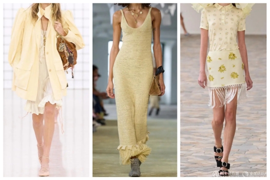 有的設(shè)計(jì)師大面積使用透明黃,再點(diǎn)綴小面積的黑色或灰色,凸顯高級(jí)質(zhì)感;有的將透明黃與米白色、淺駝色等柔和的淺色搭配,更加突出透明黃的清新感。透明黃還被巧妙地融入各種材質(zhì)中,如輕盈的雪紡、柔軟的棉麻以及光澤細(xì)膩的絲綢等。這些面料與透明黃的結(jié)合,不僅增強(qiáng)了服裝的流動(dòng)感與質(zhì)感,還讓穿著者在行走間散發(fā)出不經(jīng)意的優(yōu)雅與活力。