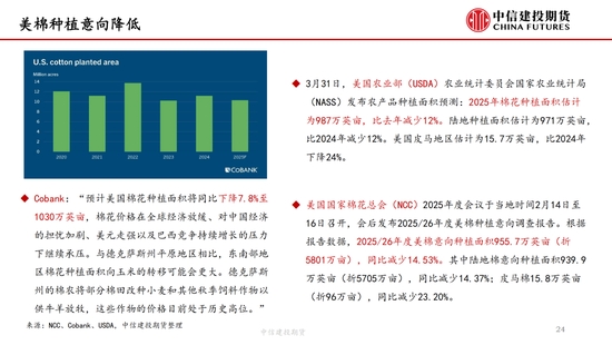 本周,“對等關(guān)稅”事件繼續(xù)發(fā)酵,但在中國強(qiáng)硬反擊以及美債收益率上升等的多重壓力下,特朗普口風(fēng)有所松動,市場情緒有所緩和,但市場對經(jīng)濟(jì)衰退的擔(dān)憂并未消失,棉紡下游市場觀望情緒濃厚。短期來看我國棉花(14690, -40.00, -0.27%)加工已基本結(jié)束,迎來純消費(fèi)季,商業(yè)庫存數(shù)據(jù)維持高位,但因部分庫存成本較高,貨主出售意愿較低,實(shí)際能夠流通庫存有限,且關(guān)稅帶來的進(jìn)口棉數(shù)量可能進(jìn)一步降低,短期供應(yīng)端的壓力進(jìn)一步減弱,因此雖然需求端的問題固然凸顯,但短期來看,在未出現(xiàn)新的突發(fā)風(fēng)險事件前提下,下方空間或已經(jīng)不大,近期現(xiàn)貨銷售基差上調(diào)明顯。另外,若目光看得更遠(yuǎn),不可忽視的是產(chǎn)量預(yù)期增加結(jié)合需求的不振,中長期的壓力依然如灰犀牛般緩步走來,因此隨著新棉種植的開啟,后續(xù)天氣的影響越發(fā)關(guān)鍵,若北半球天氣在棉花生長期風(fēng)調(diào)雨順,不排除棉價未來繼續(xù)下探的可能,棉價驅(qū)動向北半球新棉種植轉(zhuǎn)移。USDA數(shù)據(jù),截止4月13日,美棉15個棉花主要種植州棉花種植率為5%;去年同期水平為5%,較去年持平。BCO數(shù)據(jù),截至2025年4月14日,新疆棉花整體播種進(jìn)度約62.3%,播種高峰已然開啟。
