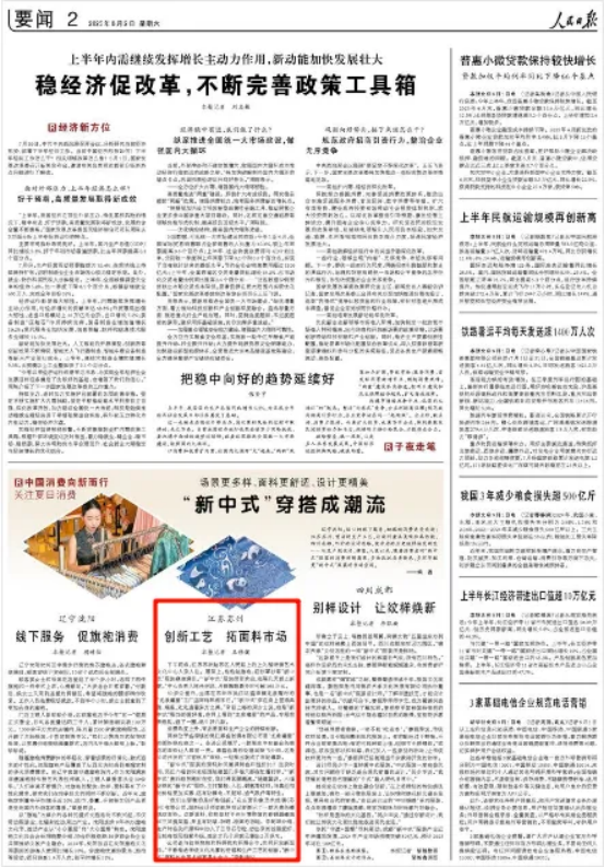 8月2日,《人民日?qǐng)?bào)》二版以《創(chuàng)新工藝 拓面料市場(chǎng)》為題,關(guān)注盛澤企業(yè)積極推動(dòng)產(chǎn)品創(chuàng)新,開(kāi)拓新興市場(chǎng)。