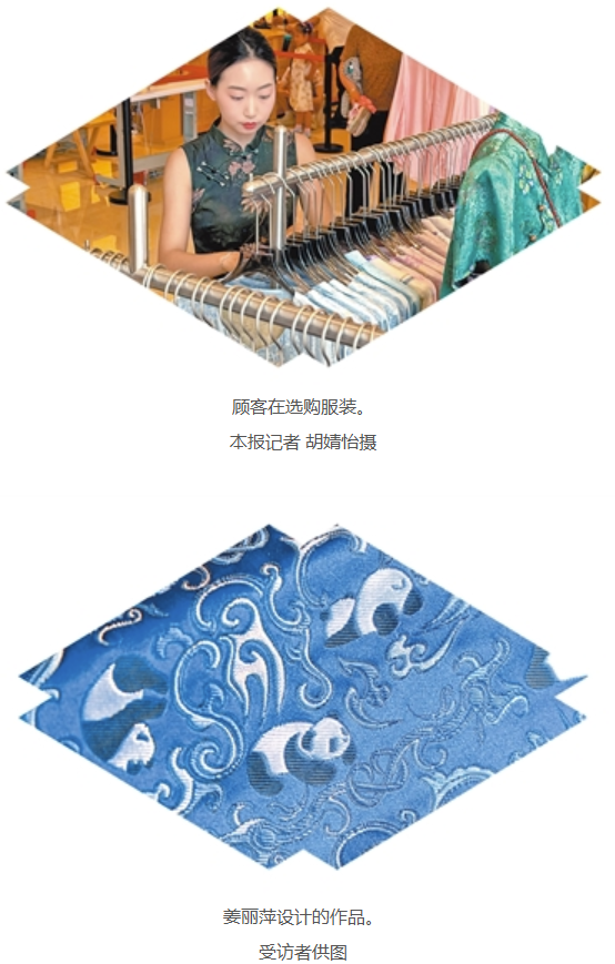“這款裙子上是我們?cè)O(shè)計(jì)的熊貓?jiān)茪饧y,很有四川特色?!泵考髌繁澈蟮膩?lái)龍去脈,姜麗萍都能娓娓道來(lái),有消費(fèi)者聽(tīng)完介紹便下單定制。
