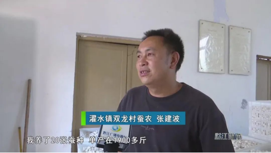 濯水鎮(zhèn)雙龍村蠶農(nóng) 張建波:“我養(yǎng)了20張蠶種,單產(chǎn)在1900多斤,總產(chǎn)值可能在4萬8千元左右。很高興,苦點值得。”