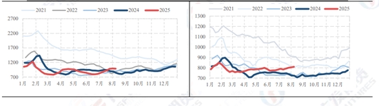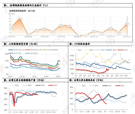 目前焦煤期貨合約主要對(duì)標(biāo)山西中硫主焦煤和蒙5精煤,現(xiàn)貨價(jià)格大漲后倉(cāng)單成本不斷走高,形成期現(xiàn)共振上漲的局面。根據(jù)汾渭統(tǒng)計(jì),截至8月11日現(xiàn)貨不同煤種焦煤價(jià)格分別為:CCI山西中硫主焦S1.3報(bào)價(jià)1260元/噸、甘其毛都蒙5原煤報(bào)價(jià)990元/噸,分別較前期低點(diǎn)上漲315元/噸、290元/噸,折算倉(cāng)單成本為山西中硫(介休)1260元/噸、沙河驛蒙5精煤1145元/噸??梢钥吹?,盤面JM2509合約價(jià)格基本平水蒙5精煤倉(cāng)單成本,由于市場(chǎng)對(duì)于后市樂觀預(yù)期,遠(yuǎn)月JM2601合約給于一定升水?,F(xiàn)貨倉(cāng)單成本抬升,后市繼續(xù)上漲的看多預(yù)期,給予期貨價(jià)格支撐。