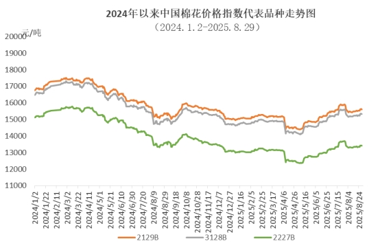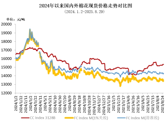 8月,國內(nèi)棉價呈先降后升走勢。月初因新棉增產(chǎn),市場供大于需求,棉價快速回落;隨后在國民經(jīng)濟(jì)運行總體平穩(wěn)、中美斯德哥爾摩經(jīng)貿(mào)會談等利好消息帶動下震蕩回升,月底增發(fā)20萬噸棉花進(jìn)口配額,對棉價影響較小。同期,國際棉價走勢偏震蕩回落,主要受美聯(lián)儲降息預(yù)期增強(qiáng)、美國對多國對等關(guān)稅正常政策生效、美棉簽約出口持續(xù)疲軟等因素影響。