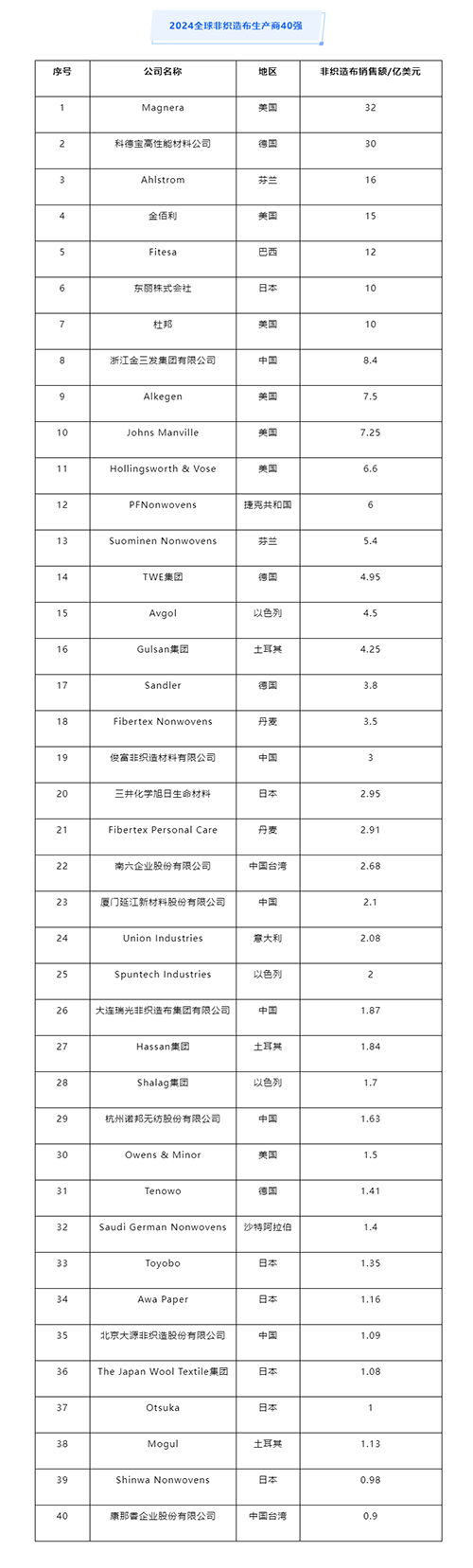 近日,Nonwovens Industry在官網(wǎng)公布了2024全球非織造布生產(chǎn)商40強(qiáng),來自中國的8家企業(yè)上榜,它們分別是:浙江金三發(fā)集團(tuán)有限公司(第8位)、俊富非織造材料有限公司(第 19 位)、南六企業(yè)股份有限公司(第 22 位)、廈門延江新材料股份有限公司(第 23 位)、大連瑞光非織造布集團(tuán)有限公司(第 26 位)、杭州諾邦無紡股份有限公司(第 29 位)、北京大源非織造股份有限公司(第 35 位)、康那香企業(yè)股份有限公司(第 40 位)。