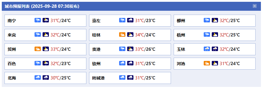 南寧市:今天白天,多云有陣雨或雷雨,今天晚上,中雨、局地大雨或暴雨,偏東風2~3級,最高氣溫31℃,最低氣溫24℃。