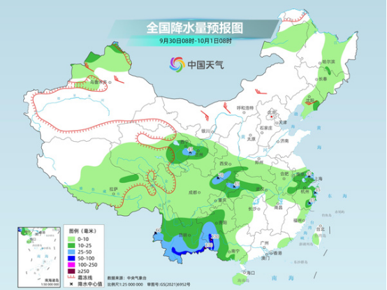 今天(9月30日),隨著今年第20號臺風(fēng)“博羅依”減弱消散,廣西、云南等地雨勢也逐漸減弱,但局地仍有大暴雨。國慶中秋假期首日,我國降雨將再度發(fā)展,華西至黃淮局地有暴雨或大暴雨來襲,恰逢出行高峰,需防范道路濕滑和低能見度帶來的不利影響。南方多地炎熱持續(xù),福建、浙江等地需警惕秋老虎,做好防暑措施。