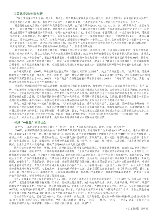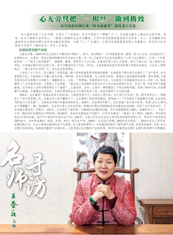 吳江盛澤有著“日出萬(wàn)綢,衣被天下”的美譽(yù),作為中國(guó)四大“綢都”之一,見證著無(wú)數(shù)本土繅絲企業(yè)的興衰。然而,在歲月磨礪中堅(jiān)守初心、一路做大做強(qiáng)的企業(yè)鳳毛麟角,江蘇華佳控股集團(tuán)就是其中佼佼者。近日,本刊編輯來(lái)到盛澤采訪全國(guó)繭絲綢行業(yè)終身成就獎(jiǎng)獲得者、全國(guó)“三八”紅旗手、江蘇華佳控股集團(tuán)有限公司董事長(zhǎng)、蘇州吳江區(qū)非物質(zhì)文化遺產(chǎn)(繅絲技藝)傳承人王春花。